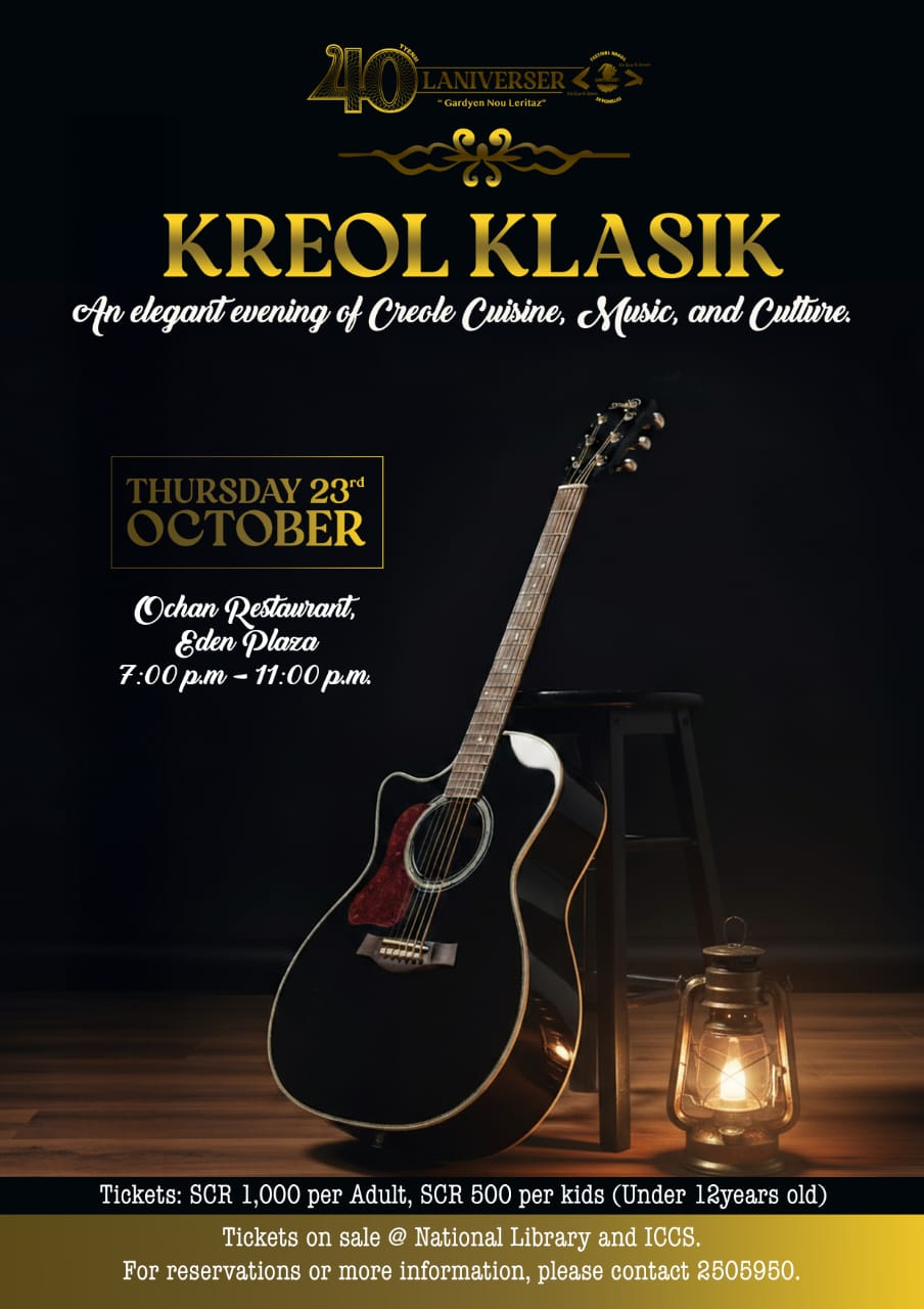 Location Ochan Eden Island Category Festival Kreol Date 23 Oct 2025 Time 19:30 Sware ʻKreol Klasikʼ Paying activity Share this event + Add to Google Calendar + iCal / Outlook export 00 days 00 hours 00 minutes 00 seconds